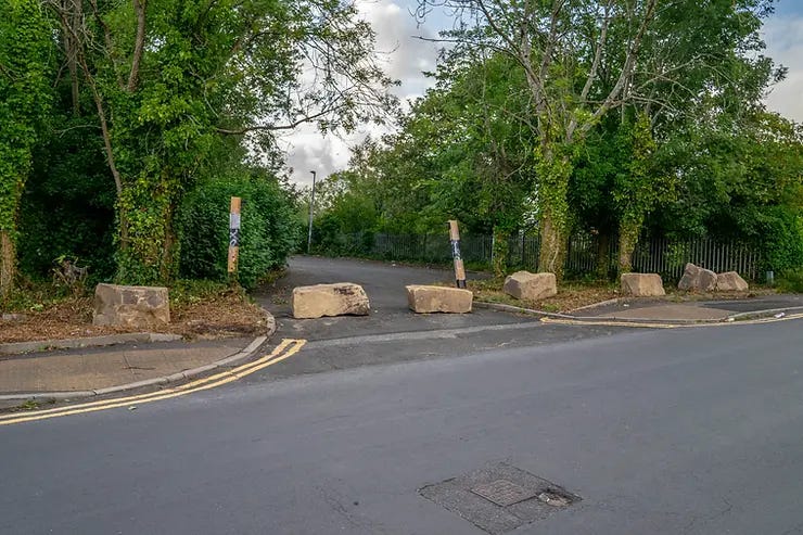 Boulders are currently in place to prevent access to the site and the shrubbery across the front has been cut back.