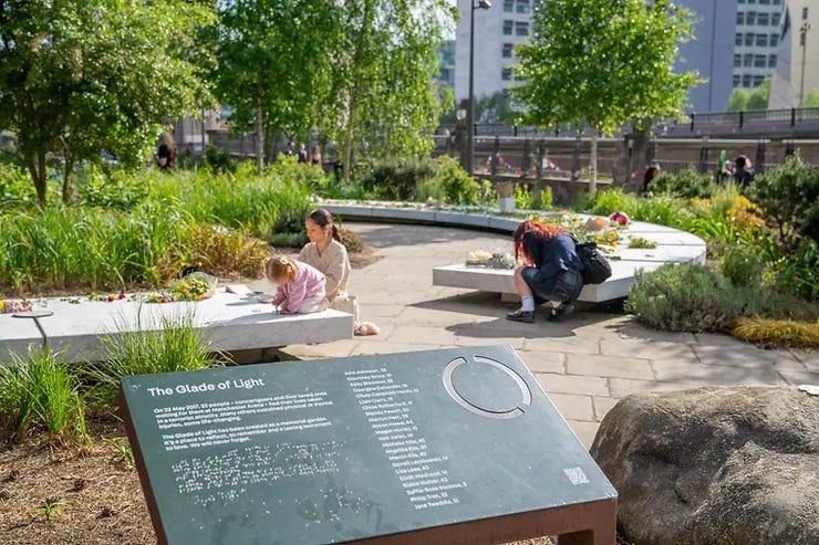 The Glade of Light Memorial is situated in the Medieval Quarter, just next to Manchester Cathedral. It opened in January 2022 and ‘honours the 22 people whose lives were taken, as well as remembering everyone who was left injured or affected.’ Their Royal Highnesses the Duke and Duchess of Cambridge attended the official opening of the Glade of Light memorial on Tuesday 10 May 2022.